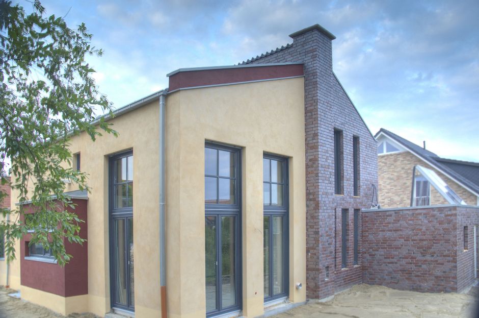 Modernes Einfamilienhaus aus zwei versetzten Baukörpern mit Pultdächern auf einem der letzten Grundstücke