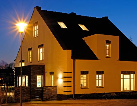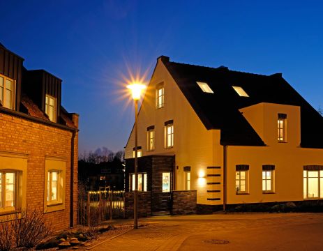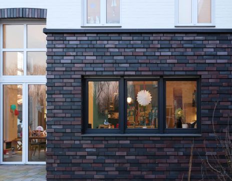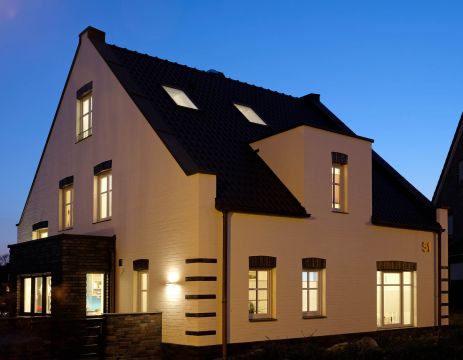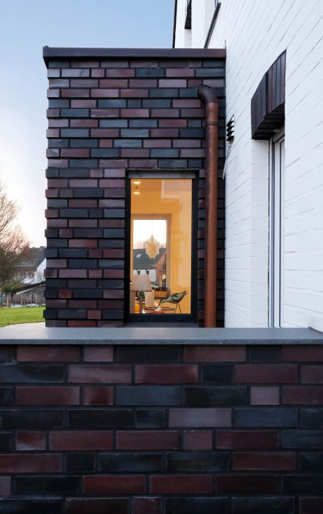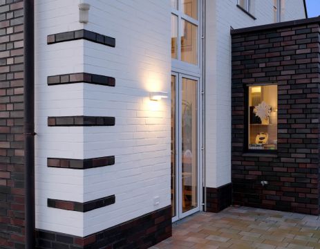 Der komplette Baukörper wurde verklinkert und anschliessend zum grössten Teil weiss geschlämmt. Im Zusammenspiel mit einem Ziegelsockel Fensterlaibungen und sorgfältigen Ziegeldetails entsteht eine klassisch-traditionelle Ausstrahlung.